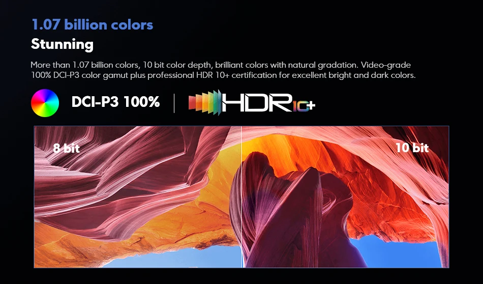 1,07 bilhões coresImpressionanteMais de 1,07 bilhão cores, profundidade de cor de 10 bits, cores brilhantes com gradação natural. Video-grade 100% DCI-P3 color gamut mais profissional HDR 10 + certificação para excelentes cores brilhantes e escuras.undefined
