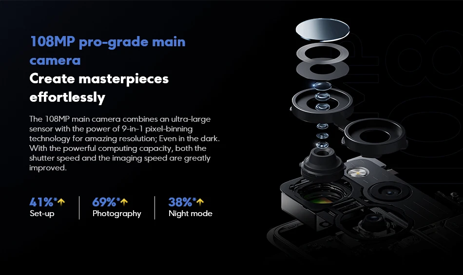 108MP pro-grade câmera principalCrie obras-primas sem esforçoA câmera principal de 108MP combina um sensor ultra grande com o poder da tecnologia de binning de pixels 9 em 1 para uma resolução incrível; Mesmo no escuro. Com a poderosa capacidade de computação, tanto a velocidade do obturador quanto a velocidade da imagem são bastante melhoradas.undefined