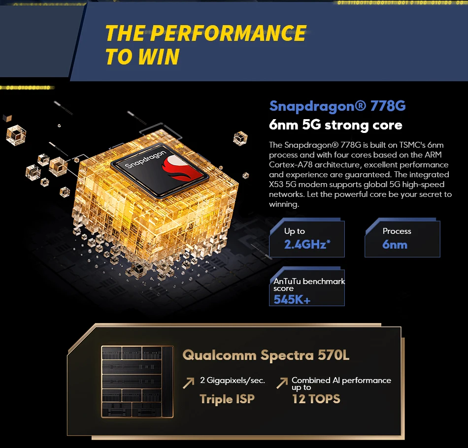 Snapdragon® 778G, núcleo forte 6nm 5GO Snapdragon® 778G é construído no processo de 6nm da TSMC e com quatro núcleos baseados na arquitetura ARM Cortex-A78, excelente desempenho e experiência são garantidos. O modem X53 5G integrado suporta redes globais de alta velocidade 5G. Deixe o núcleo poderoso ser o seu segredo para vencer