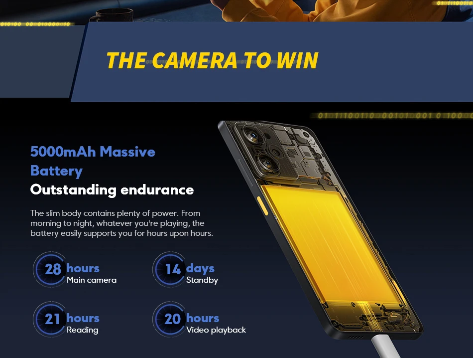 Bateria 5000mAh maciçaExcelente resistênciaO corpo magro contém a abundância do poder. De manhã à noite, independentemente do que estiver a jogar, a bateria suporta-o facilmente durante horas e horas.undefined