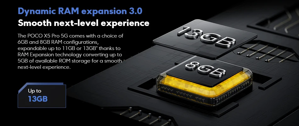 Expansão RAM dinâmica 3.0Experiência suave de próximo nívelO POCO X5 Pro 5G vem com uma escolha de configurações de 6GB e 8GB RAM, expansível até 11GB ou 13GB * graças à tecnologia RAM Expansion, convertendo até 5GB de armazenamento ROM disponível para uma experiência suave de próximo nível.undefined
