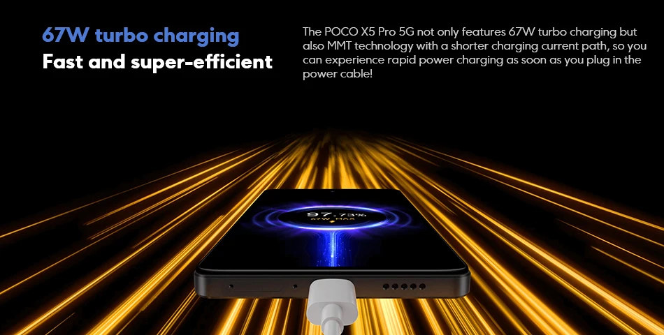 Carregamento turbo 67WRápido e super eficienteO POCO X5 Pro 5G não apenas possui carregamento turbo 67W, mas também a tecnologia MMT com um caminho atual de carregamento mais curto, para que você possa experimentar o carregamento rápido de energia assim que conectar o cabo de alimentação!undefined